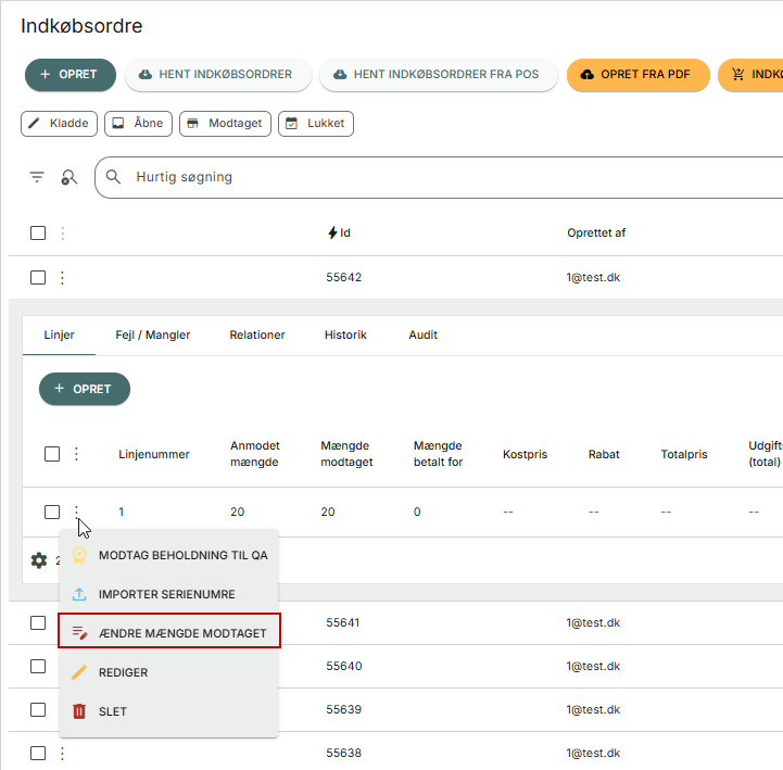 Har du modtaget på en forkert indkøbsordre, eller har du modtaget forkert mængde på en indkøbsordre, så kan du ændre mængden via Indkøb > Indkøbsordre.
