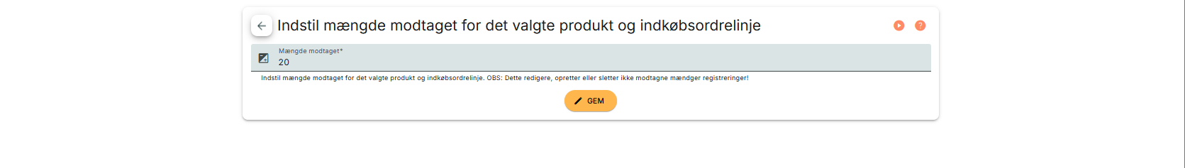 Herefter viser PeakWMS en side, hvor du kan angive den korrekte mængde.