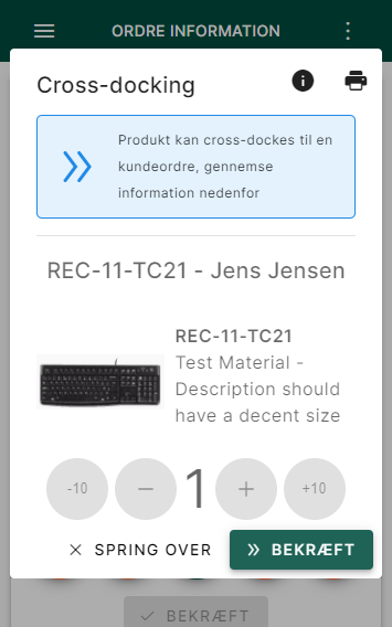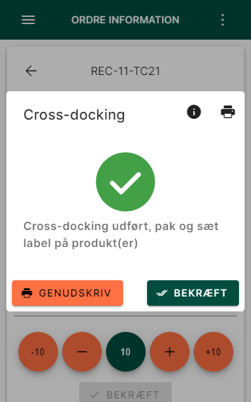 Når en ordre kan cross dockes, viser PeakWMS en pop up i varemodtagelsesflowet.
