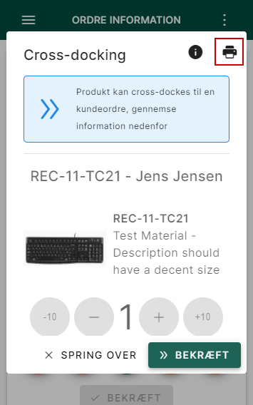 Ved cross docking til single line ordrer, printer PeakWMS automatisk en shipping label til ordren og sætter den i status pakket, når cross docking bekræftes, hvis der er valgt en printer i flowet. Du vælger en printer på knappen på billedet nedenfor.