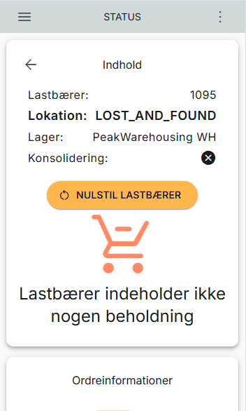 OBS! Er der registreret en ordre, og ligger der varer i status “Plukket” i lastbæreren, er det ikke muligt at nulstille lastbæreren. Her viser PeakWMS en fejlbesked der forklarer, at lastbæreren indeholder varer og en ordre i status plukket, og at lastbæreren skal scannes i pakkeprocessen, for at afslutte ordren korrekt.