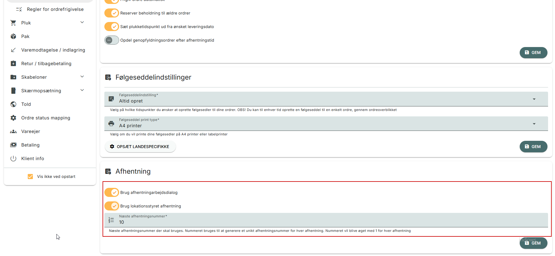 Afhentningsflowet slået til under Indstillinger > Ordrer > Ordrestyring. Afhentningsflowet kan bruges med eller uden lokationsstyring.
