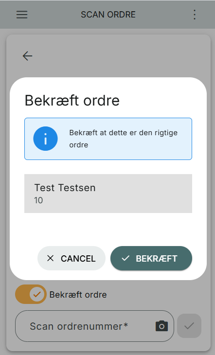 Har du "Bekræft ordre" slået til, vil du få vist en pop up med kundeinformationer, som skal bekræftes, inden afhentningsflowet for ordren kan gennemføres.