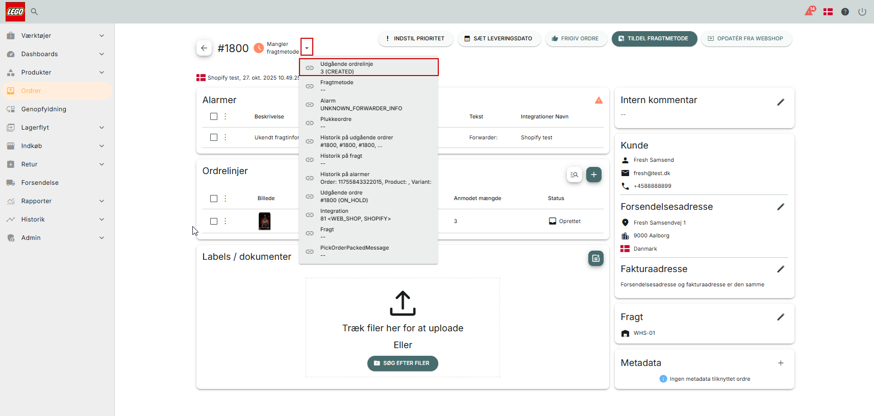 Bruger du labelhenting "Ordrefrigivelse", kan du komme ud for, at ordren vil gå på hold pga. manglende toldinformationer på ordren. Hvis ikke ordren går på hold, vil der blive vist en fejl, når ordren scannes i pak, da PeakWMS forsøger at hente label til ordren i dette step.