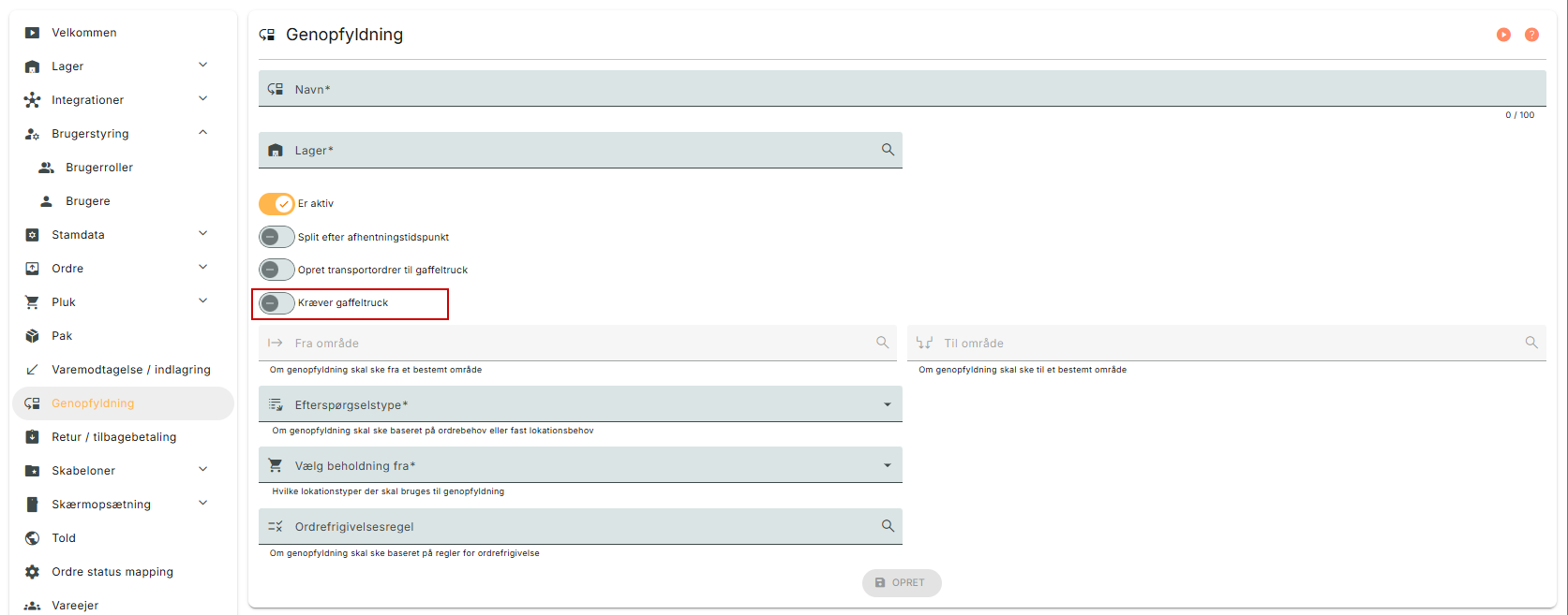 Du har mulighed for at angive i din genopfyldning, om genopfyldningsopgaverne i en specifik genopfyldningskonfiguration kræver gaffeltruck, for at gennemføre opgaverne.