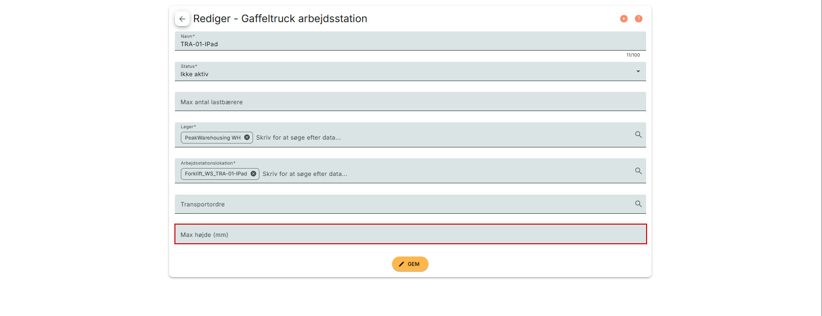 For at funktionen fungerer, skal du angive en max højde (mm) på dine gaffeltruck arbejdsstationer under Admin > Transport > Gaffeltruck arbejdsstationer. Derudover skal der være højde på dine lokationer.