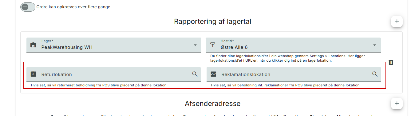Der angives retur/reklamationslokationer pr. lager, der er tilføjet under "Rapportering af lagertal" på Shopify integrationen.