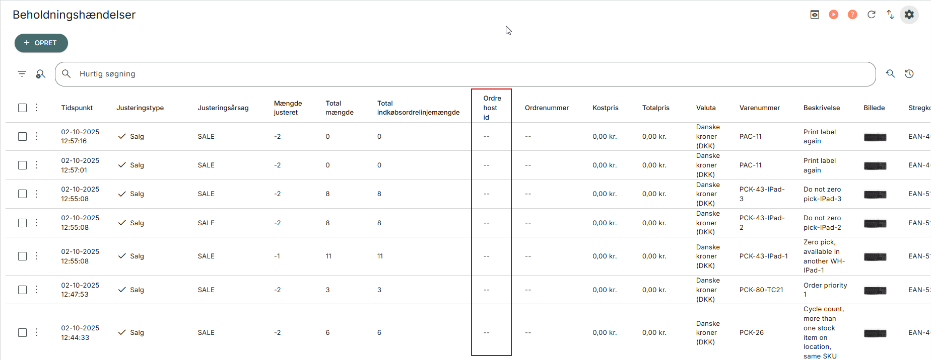Kolonnen "Ordre host id" skal tilføjes til Beholdningshændelser via Tabelindstillinger i dialogen, for at blive vist.