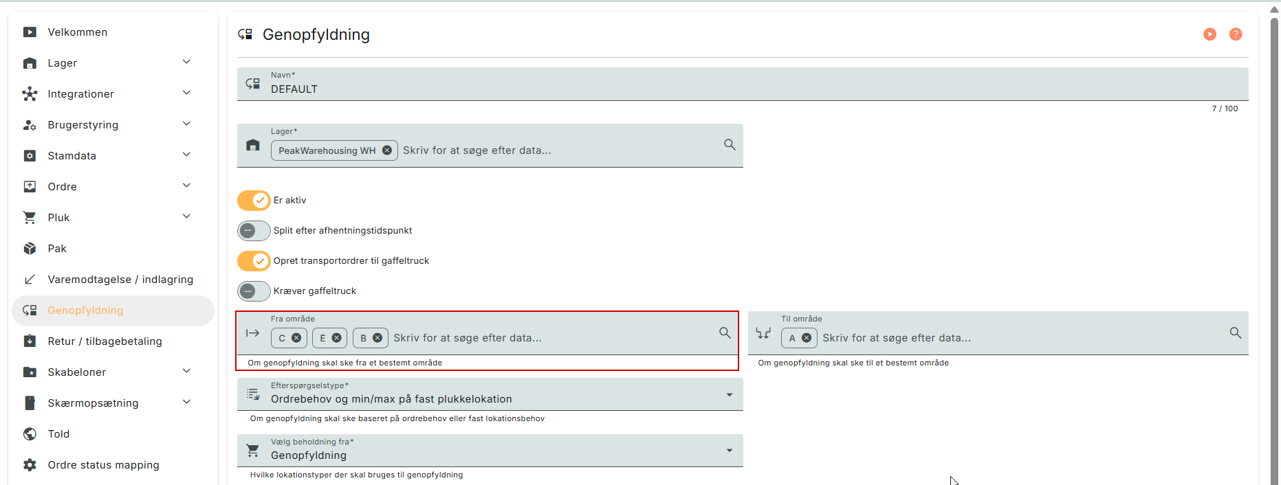 Det er nu muligt at angive mere end ét "fra"-område i sin genopyldningkonfiguration. Der kan nu vælges flere "fra"-områder. Genopfyldningsopgaverne forsøges dermed oprettet fra flere forskellige områder.