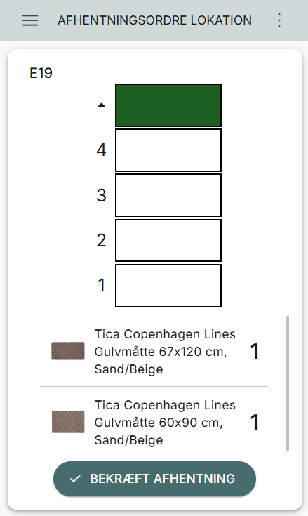 Benyttes afhentning med lokationsstyring, vises en liste over varerne, der skal afhentes på ordren, på samme skærm, som brugeren får vist lokationen, som ordren er placeret på.