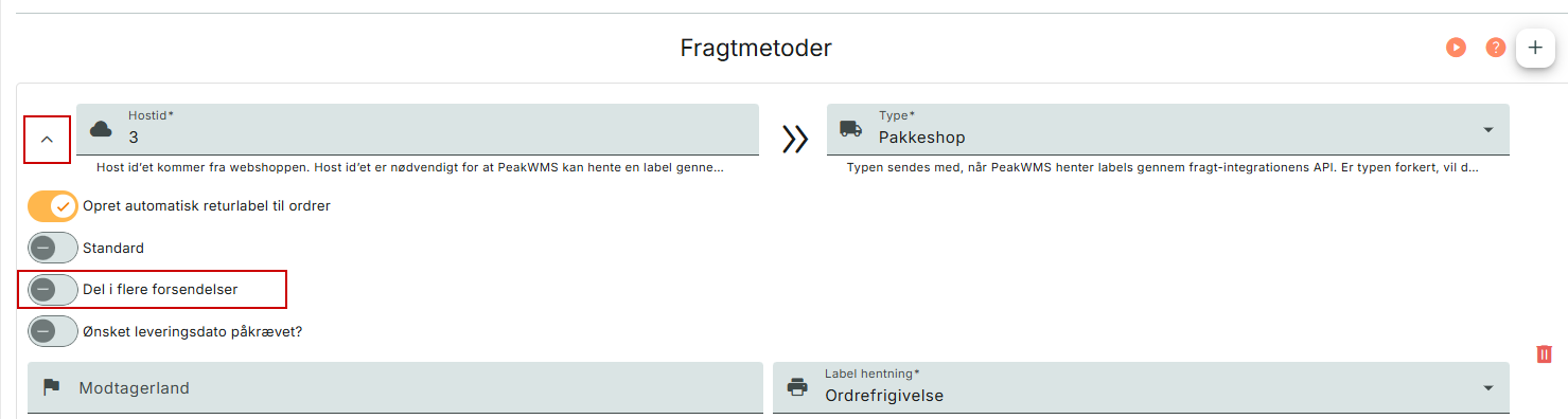 Når indstillingen er slået til, vil PeakWMS ved label-generering opdele ordren i flere separate forsendelser i stedet for én samlet forsendelse med flere pakker.