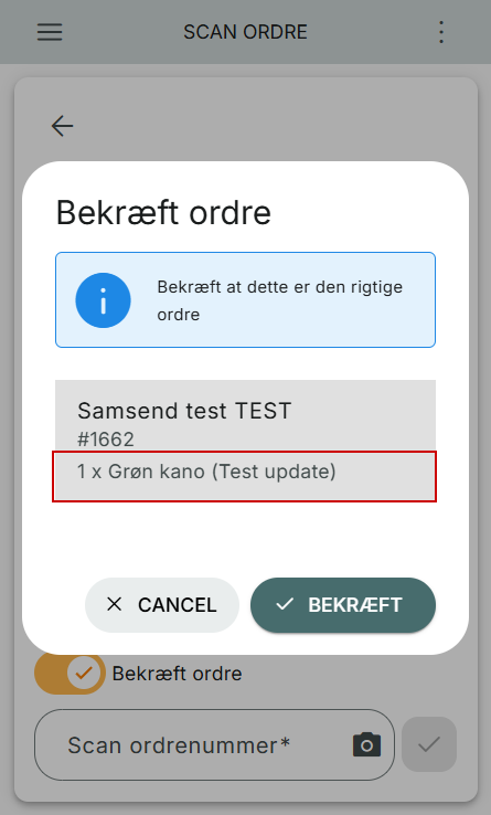 Bruges afhentning uden lokationsstyring, vises en pop up med informationer om varerne, der er på ordren, der afhentes. Varerne vises i den boks, der kommer frem med "Bekræft ordre", når ordrenummeret er scannet i dialogen.