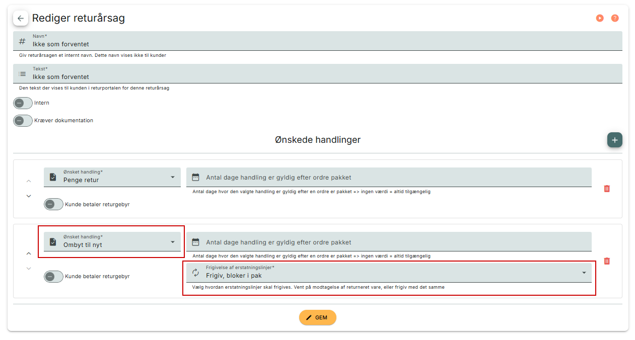 Under Indstillinger > Retur/Tilbagebetaling har du mulighed for at opsætte regler for frigivelsen af erstatningslinjer, for de enkelte returhandlinger, du har i returportalen.