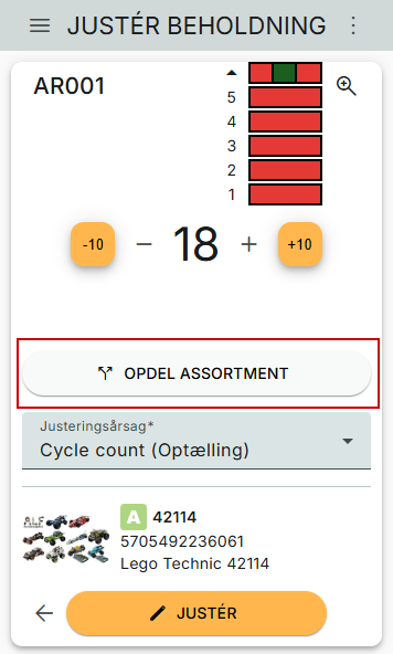 Du splitter en assortment under Værktøjer > Beholdning, ved at søge en assortment frem og justere den. Herefter vises en knap med "Opdel assortment".