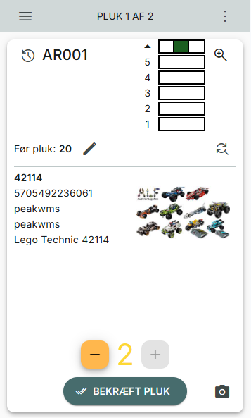 Når du plukker assortments, plukker du også selve den assortment, som er oprettet. Du vil ikke blive bedt om at plukke de enkelte underprodukter. Plukkeren ved ikke, hvilke produkter, der indgår i den assortment, der plukkes.
