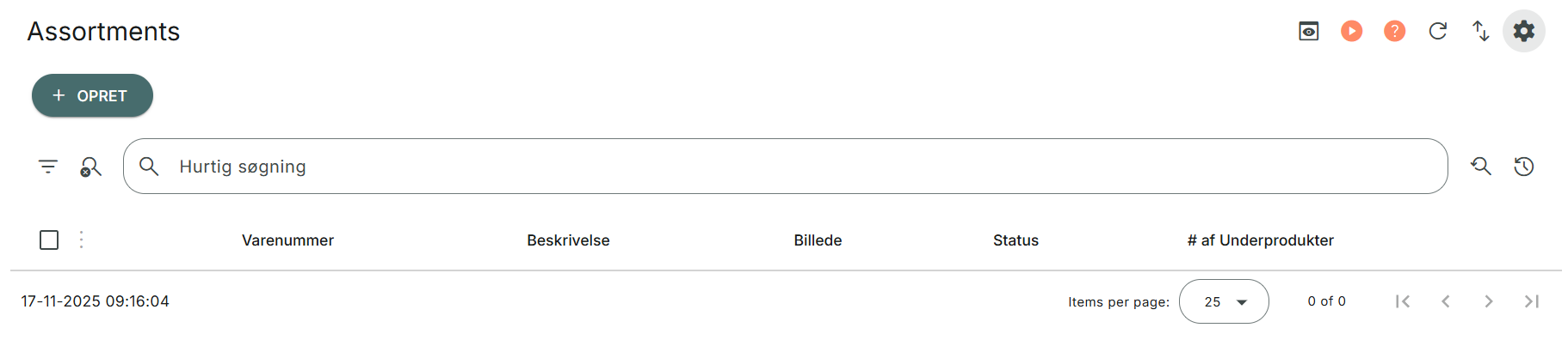 Vil du oprette assortments direkte i PeakWMS, gøres det under Produkter > Assortments. Du opretter en assortment ved at klikke på "Opret".